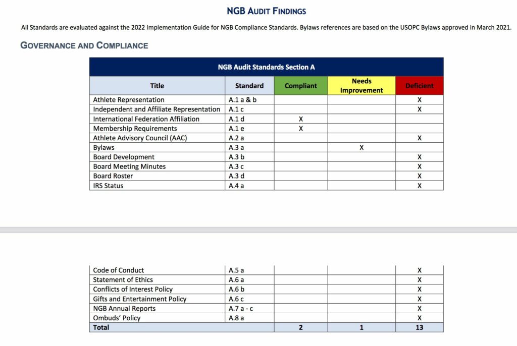 In einem offiziellen Untersuchungsbericht von der USOPC (United States Olympic & Paralympic Committee) werden n massive Fehler und Versäumnisse von USA Skateboarding aufgelistet. Auf 18 Seiten werden Vergehen gegen die Statuten aufgeführt und direkte Anweisungen zur Behebung der Fehler gegeben. Es liesst sich wie ein Armutszeugnis und macht deutlich, dass die Verantwortlich in den USA teilweise unfähig sind.