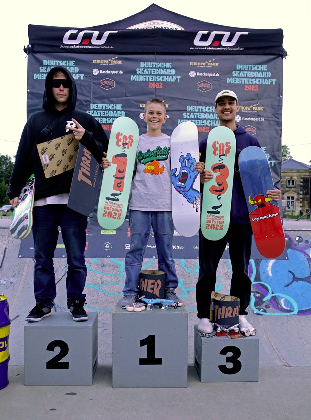 Die seit 2023 wieder frisch aufgelegte, COS-eigene Amateurgruppe zählte in Dresden 12 Teilnehmer*innen. Die FLINTA*-B-Division repräsentierte die insgesamt jüngste Fahrerin, die 8-jährige Maja Kallisch allein, aber dafür mit viel Freude am Skateboarden – weiter so! In der MALE-B-Division sind 11 Nachwuchs- und nicht-gesponserte Skater angetreten. Die Besten 5 bestritten das Final und sicherten sich damit die Quali für Ibbenbüren. Der 11-jährige Gabriel Kahl aus Potsdam gewinnt mit 14 Punkten Vorsprung vor Paul Schmidt. Dritter wurde Toni Forgber.