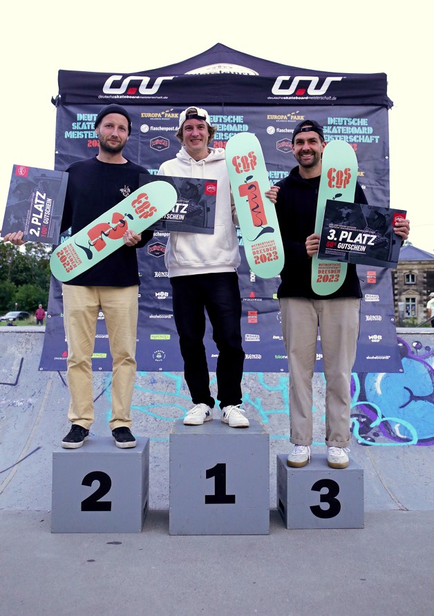 7 Old Dogs sind nach Dresden gekommen. Für die besten 5 ging’s, wie bei den Pros, erst in die Single- Runs und dann für Best-of-5-Tries an die vorab ausgewählten Obstacles, Quarter, Rail & Hausdach. Sandro Eiselt, mit 39 Jahren einer der beiden ältesten Teilnehmer, macht im Final mit Street League Charakter den 1. Platz. Der Local Nick Freeman Wauer den Zweiten und Thomas Prochaska den Dritten. Auch hier sind alle für die 26. Deutsche Skateboard-Meisterschaft qualifiziert, außer des amtierenden Senior Deutschen Meisters, Thomas Meinel, der sich leider verletzt hat und am Ende den Contest nicht mehr mitfahren konnte – wir drücken die Daumen, dass es bald wieder läuft.