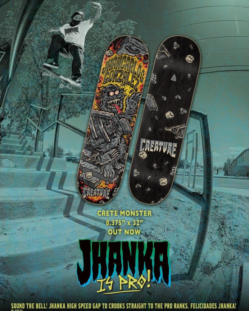 Bei der „Gang Green“ gibt es seit neustem einen neuen Pro Fahrer! Jhank Gonzalez Ortiz ist Pro für Creature Skateboards geworden. Und das erste Signature Pro Model Board ist bereits fertig Design und auf den Weg in die weltweiten Skateshops!