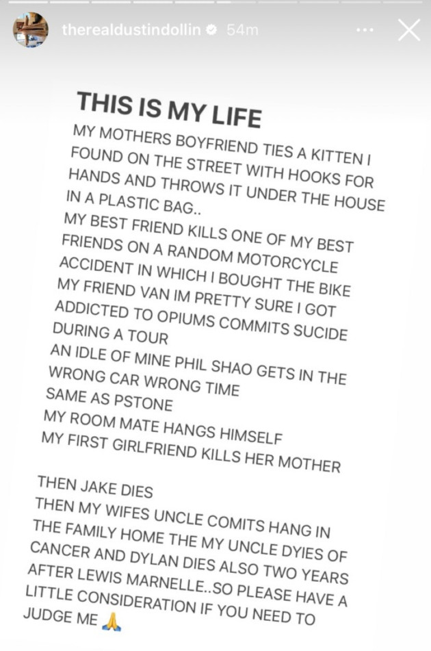 Wie sehr im die Probleme zu schaffen machten, zeigt das Posting unten, wo Dustin sich fragt, wozu man eigentlich leben soll. Außerdem postet er eine Liste von Freunde und Familienangehörigen, die sich umgebracht oder getötet wurde. Leider eine sehr, sehr lange Liste.