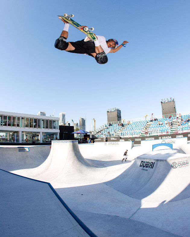 Hier an der Küste Dubais überragen uns Wolkenkratzer, von denen jeder ein kleines Wunderwerk der Ingenieurskunst und ein Denkmal für den Einfallsreichtum der Menschheit ist. Das Gleiche gilt auch für die Kreation von California Skateparks für diesen Wettbewerb, und wir sollten uns einen Moment Zeit nehmen, um die unermüdliche Arbeit des slowenischen Handwerksmeisters Davor Milkjovic und seines Teams zu loben, die seit Wochen hier draußen waren, um diesen Park zu errichten.