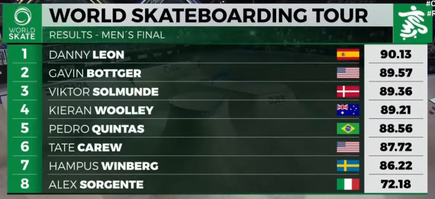 Für die Herrenklasse wäre es eine iberische Wiederholung, denn Danny Leon gewann sein erstes WST-Finale. Zweiter wurde der fehlerfreie Gavin Bottger, der alle drei seiner Runs perfekt machte und damit der einzige Skater in beiden Finals war, dem dies gelang, während auf dem dritten Platz Rune Glifbergs 16-jähriger dänischer Schützling Viktor Solmunde landete.
