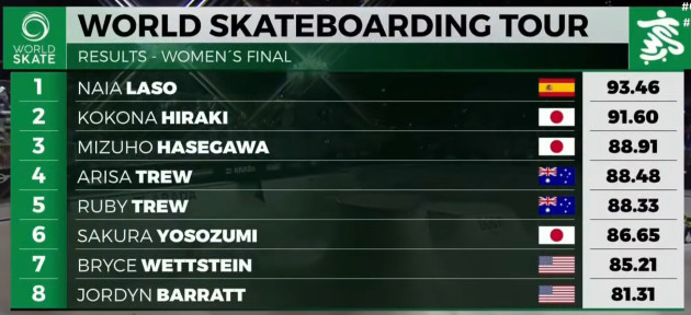 Der Rahmen für das Frauenfinale hätte nicht besser sein können: Alle acht Skater machten ihre ersten Läufe, bei denen auch die erste weibliche 90+-Wertung des gesamten Wettbewerbs erzielt wurde, wobei die Japanerin Kokona Hiraki den ersten von zwei Läufen erzielte Sie erzielte in ihrem Auftaktspiel zwei aufeinanderfolgende 91 Punkte.