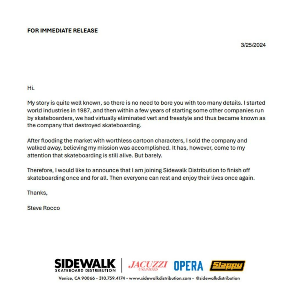 Deshalb möchte ich bekannt geben, dass ich mich Sidewalk Distribution anschließe, um Skateboarding ein für alle Male zu zerstören. Dann kann jeder wieder zur Ruhe kommen und sein Leben genießen.