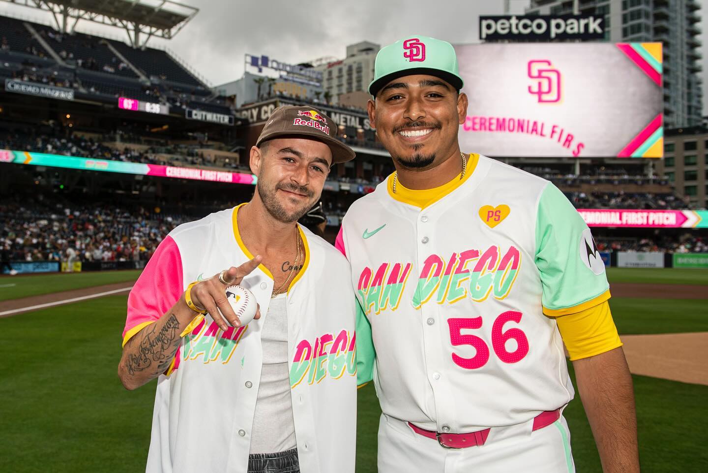 SK8Mafia Skateboards Pro TJ Rogers wirft den Ceremonial 1st Pitch beim MLB Spiel der San Diego Padres