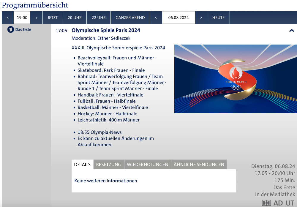 6.08.2024 – ARD Sportschau Olympia ab 17.05 Uhr (Skateboard Park Finals Frauen startet um 17.30 Uhr)