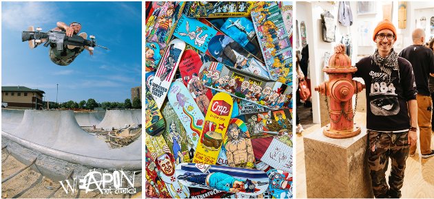 Eine Auswahl der Exponate der Ausstellung WEAPON OF CHOICE (LINKS+MITTE) und Jürgen Blümlein, Kurator und Kreativdirektor des SkateboardMuseum Berlin (RECHTS)