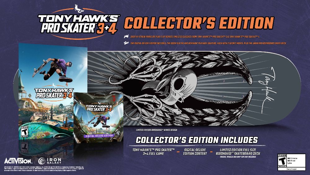 Wer tief in die Tasche greifen kann und will gönnt sich im Zweifel sogar die Collector’s Edition! Die kommt mit den beiden Games und einem echten Birdhouse Tony Hawk Board. Das Ganze ist natürlich „streng“ limitiert. Zusätzlich gibt es noch ein gedrucktes Autogramm von Tony und alle Vorteile der Deluxe Edition (siehe Grafiken unten).