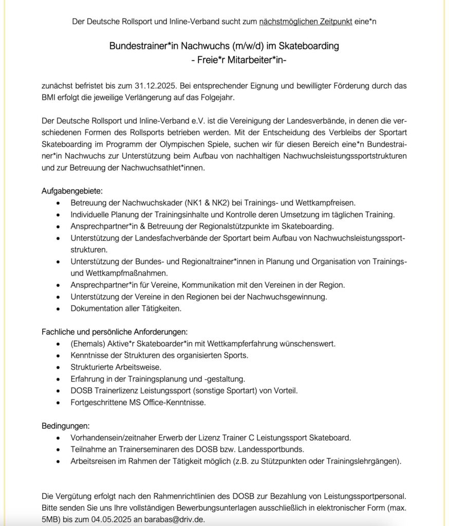 Das Team Germany vom DRIV Verband (das sind die die sich um die Olympia Geschichte kümmern) haben ZWEI Stellen zu vergeben: Bundestrainer für Nachwuchs im Skateboarding (m/w/d) und Bundestrainer Skateboarding (m/w/d).