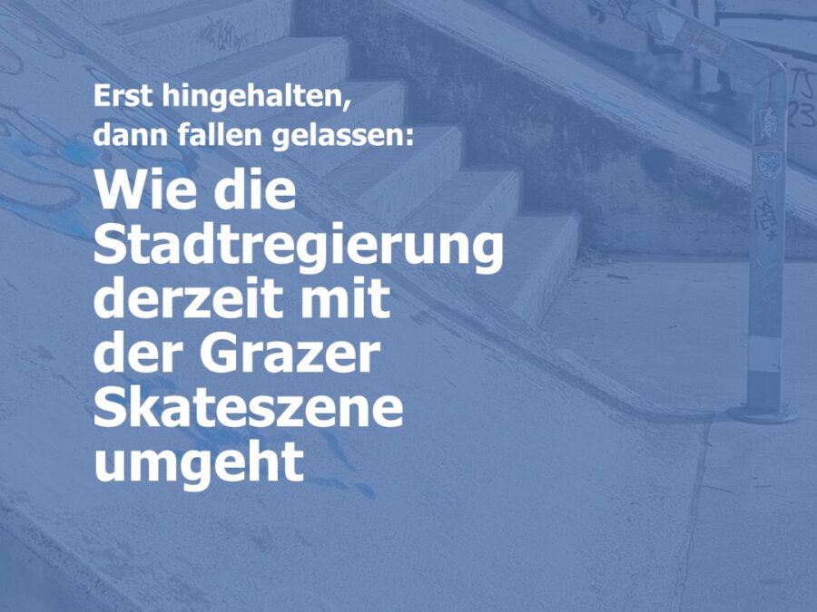 Die einzige Skatehalle sperrte im Winter endgültig zu, anstatt eine Lösung zu suchen, hat die Stadtregierung beschlossen, dass wir in den nächsten Jahren eh keine Halle brauchen und das Budget gekürzt. Und weil man schon dabei war, den Grünanger-Umbau auch gleich abgesagt – er könnte jetzt schon im vollen Gange sein. Aber hey! Das ist eh „kein Problem“, weil es einen neuen Bezirkssportplatz in Reininghaus gibt – das ließ Finanzstadtrat Manfred Eber (KPÖ) der Skateszene über die Medien ausrichten. Gleichzeitig gibt man Geld für sündteure Plakatkampagnen aus, auf denen man uns sagt, dass wir uns nicht so aufführen sollen und an Ruhezeiten halten müssen.