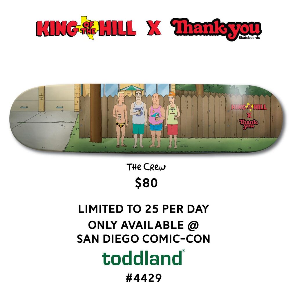 Vor einem Monat fand in San Diego die Comic-Con Messe statt und Thank You Skateboards verkaufen nur dort pro Tag 25 limitierte „King of the Hill“ TV-Show Boards. Wer eins von der beliebten Animationsserie haben wollte, musste nach San Diego reisen. Und Glück haben dass er eins der 25 Boards bekam.