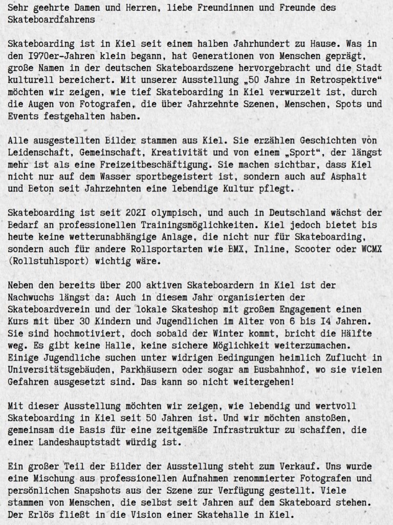 – Eine große Fotoausstellung mit Arbeiten von Helge Tscharn, Friejof Feye, Gerd Rieger, Christian Isachsen, Torben Kotzur, Bevis Nickel, Anders Prey, Maik Ruhrbach, Bernd Graupe, Sönke Bruhn und vielen weiteren, die die Kieler Skategeschichte geprägt und dokumentiert haben.