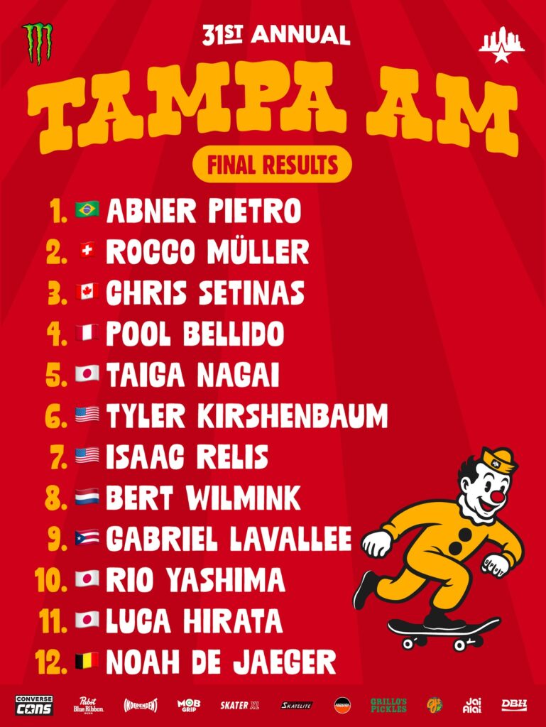 Das wars, die Sieger vom Tampa AM 2025 stehen fest und schreiben sich in die Geschichtsbücher ein! Abner Pietro aus Brasilien stahl alle anderen die Show und lieferte einen perfekten Final Run ab.
