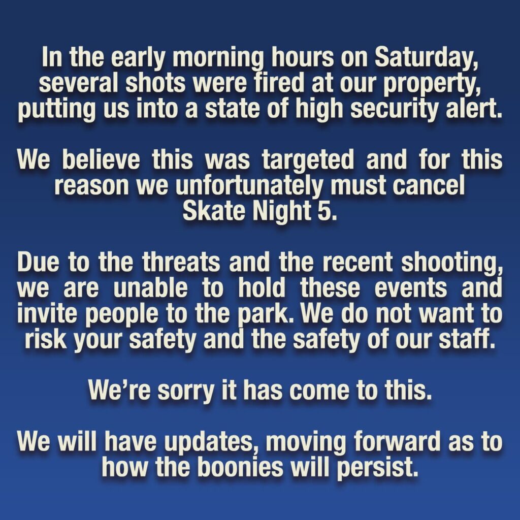 Nach dem Anschlag wurde das Boonies Game of Skate Tunier abgesagt. Der Contest, an dem Fahrer wie Jordan Maxham und Lamont Holt teilnehmen, spendiert ein Preisgeld von 20.000 US-Dollar für den Sieger! Wie Pool bekannt gab, könne man das Sicherheitsrisiko für Mitarbeiter und Skateboarder nicht eingehen und müsse das Finale vorerst absagen.