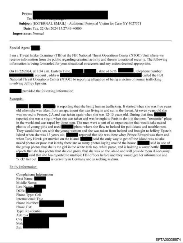 Eine interene E-Mail des FBI berichtet von einem möglichen Opfer und dessen Aussagen. Die Frau war damals 13 Jahre alt und beschreibt , wie sie an verschiedene Orte wie z.B. Fresno, Kalifornien, Paris und Irland gebracht wurde um sie dortzu sexuellen Handlungen zu zwingen.