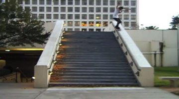 Wenn ich mich recht entsinne, dann ist das hier die berühmte Hubba Ledge, die schon Stars wie Chad Muska versucht haben zu bezwingen (Frontside Tailslide to fakie?). David Hafsteinsson nimmt den Kampf mit diesem Biest auf und steht am Ende einen Backside Krooked Grind … aber der Weg dorthin war steinig: