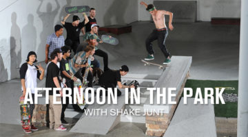 Perfekte Einstimmung für den heutigen Skatetag: Die Shake Junt Crew war mit Kevin Romar, Jeff Lenoce, Shane Heyl, Tony Tave, Moose, Jon Dickson, Sinner, Pete Eldridge, usw., in der TransWorld Skateboarding Halle.