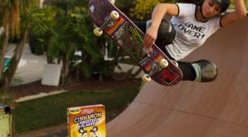 Birdhouse Pro Lizzie Armanto scheint einen kleinen Sponsordeal mit Kellogs zu haben oder zumindest eine Werbeanzeige für „Cinnamon Forsted Flakes“ …